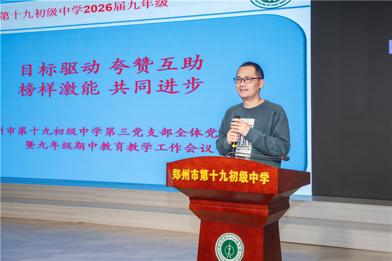 为科学诊断前半学期教育教学成效,精准把握教学动态,协同优化育人策略,2025年11月20日,郑州市第十九初级中学召开第三党支部全体党员大会暨九年级期中教育教学工作会议。学校党总支书记、校长朱玉国、副校长冯超强、政教处主任陈薇及全体九年级教师参与会议。此次会议由九年级年级长姚孩主持。
