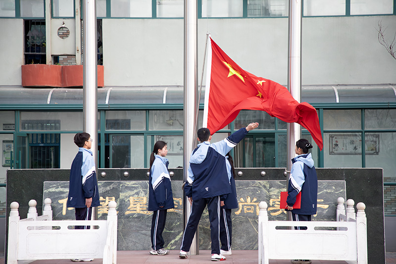 仪式进行第一项,升国旗,奏唱国歌。国旗护卫队的同学们迈着矫健的步伐,护送着鲜艳的五星红旗走向国旗台。伴随着雄壮的国歌,五星红旗在全体师生的注目下缓缓升起,鲜红的旗帜迎风展开,激昂的旋律在校园里久久回荡,深深触动着每一位师生的爱国心。