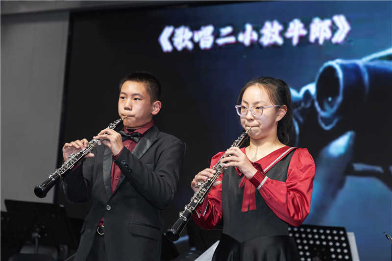 双簧管声诉英烈,少年壮志照山河。婉转深情的双簧管旋律,讲述了王二小为掩护乡亲、诱敌深入的英雄事迹。旋律中饱含着对小英雄的缅怀与敬仰,让在场师生在动人的音乐中感悟少年英雄的家国情怀,铭记英烈精神。
