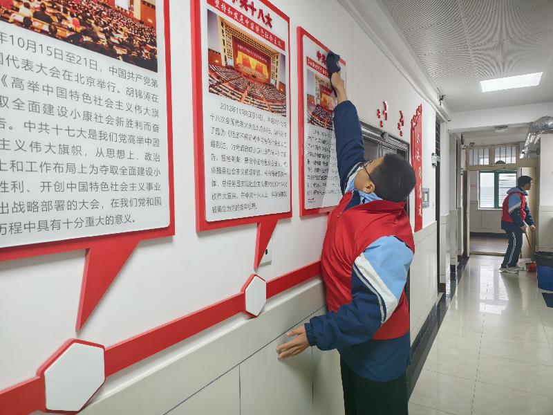 同学们分工协作、热情高涨,有序开展校园清洁志愿服务。大家手持扫帚、抹布等工具,认真清扫校园道路与公共区域垃圾,细致打扫教室、广播室卫生,用心擦拭校园展板,不放过任何卫生死角。同学们干劲十足、配合默契,忙碌的身影成为校园里一道温暖的风景线,经过共同努力,校园环境更加整洁有序,公共区域焕然一新。