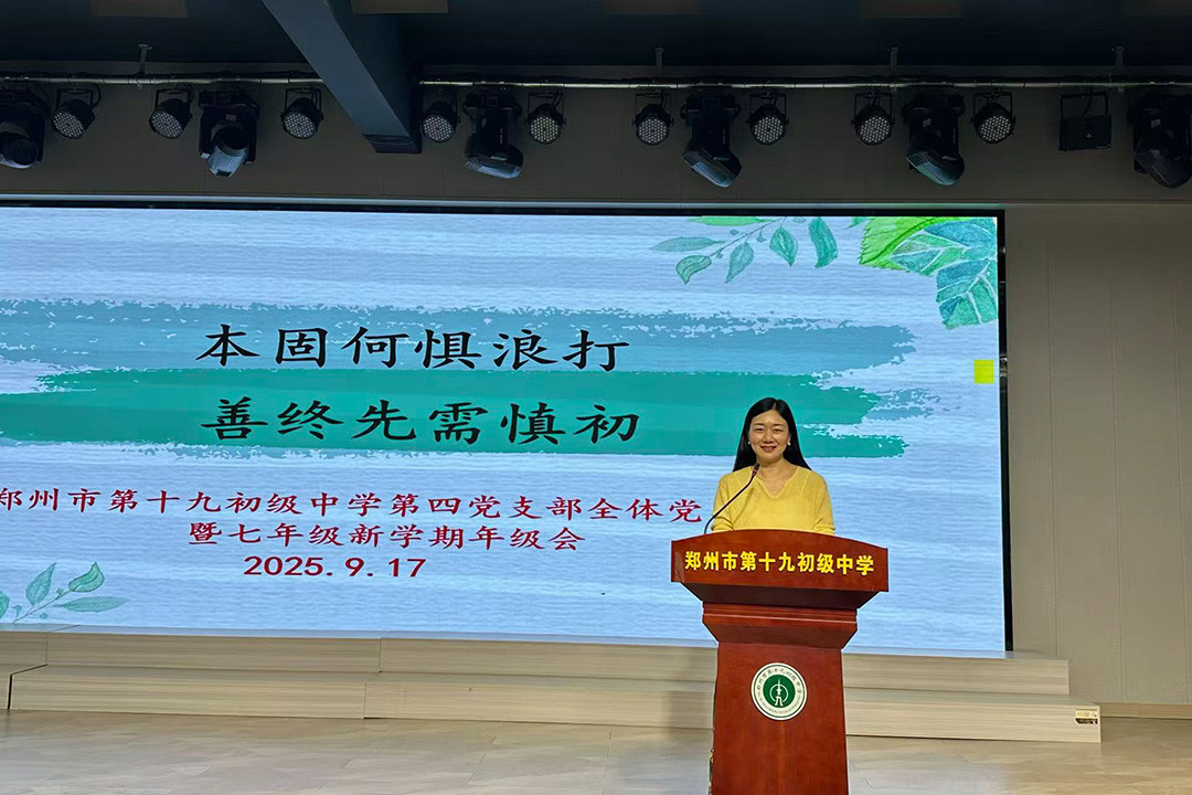 秋兰飘香,征程再启。2025年9月18日下午,郑州市第十九初级中学召开了第二支部全体党员大会暨新学期年级会。本次会议以“情绪护航,习惯筑基;课堂提质,学法赋能”为主题,旨在统一思想、深化认识、科学分析、精准规划,为新学期的教育教学工作指明方向、注入动能。会议由年级长黄洁主持,学校党总支书记、校长朱玉国,副校长冯超强、文涛,教务主任陈正和、副主任朱昌盛,政教主任陈薇、副主任郭永保及全体八年级教师参与会议。