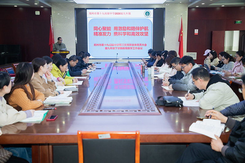 为总结上学期工作经验,全面做好新学期教育教学工作,凝心聚力求突破,2026年3月12日,郑州市第十九初级中学召开了第三党支部全体党员大会暨九下新学期工作会。学校党总支书记、校长朱玉国、副校长冯超强及全体九年级教师参与会议。会议由九年级年级长姚孩主持。
